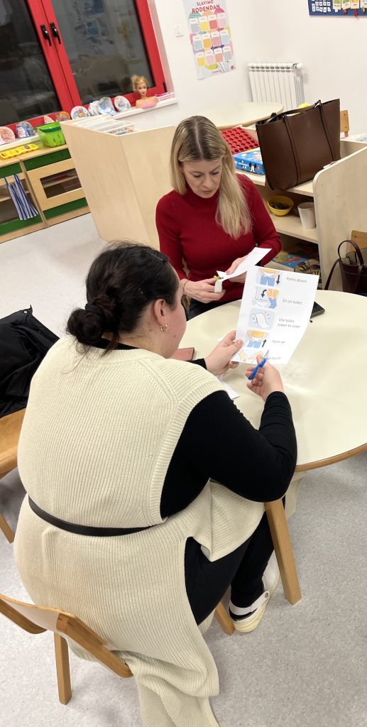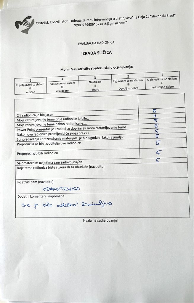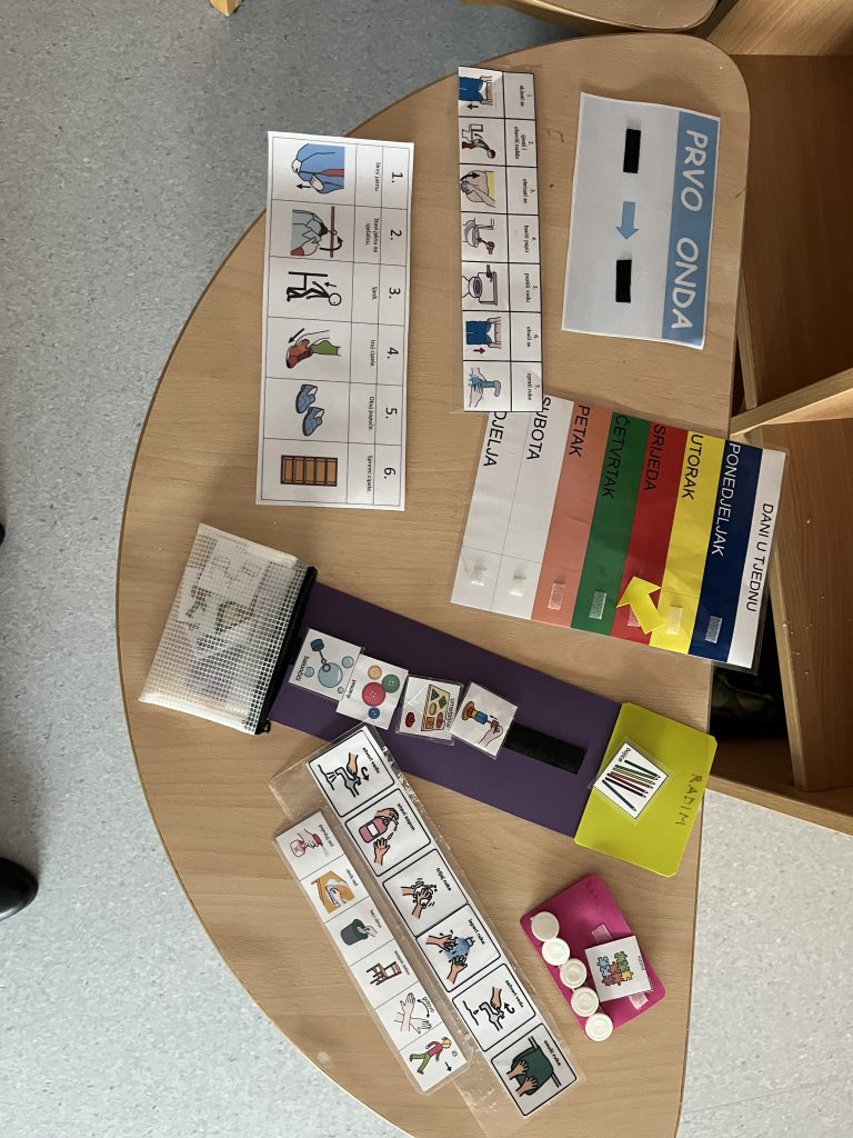 Nakon provedenih radionica o vizualnoj podršci koje su se više odnosile na neke teorijske odrednice i značajke, te prikaz primjera dobre prakse nastavili smo sa još dvije radionice na temu “Izrada sličica” i “Kreiranje vizualnih rasporeda”. Nakon usvojenih teorijskih odrednica i pogledanih različitih primjera korištenja istih odgojitelji, roditelji i članovi stručne službe imali su priliku i sami izraditi sličice i vizualne rasporede. Svatko je krenuo od svoje problematike te na kraju ponio kući i/ili u odgojno-obrazovnu skupinu neku od oblika vizualne podrške koja će uvelike olakšati rad i biti podrška djeci pri svladavanju zahtjevnih vještina s kojima se susreću. Svi su kući otišli ispunjeni jer smo ispunili svoj cilj dolaska, a to je prenijeti znanja o načinima izrade različitih vrsta vizualne podrške te izrada određenih vrsta vizualne podrške za koju smatraju da bi mogla pomoći u olakšavanju funkcioniranja djeteta i /ili stjecanja novih sposobnosti i vještina. Veselimo se sljedećim druženjima i novim znanjima i saznanjima.